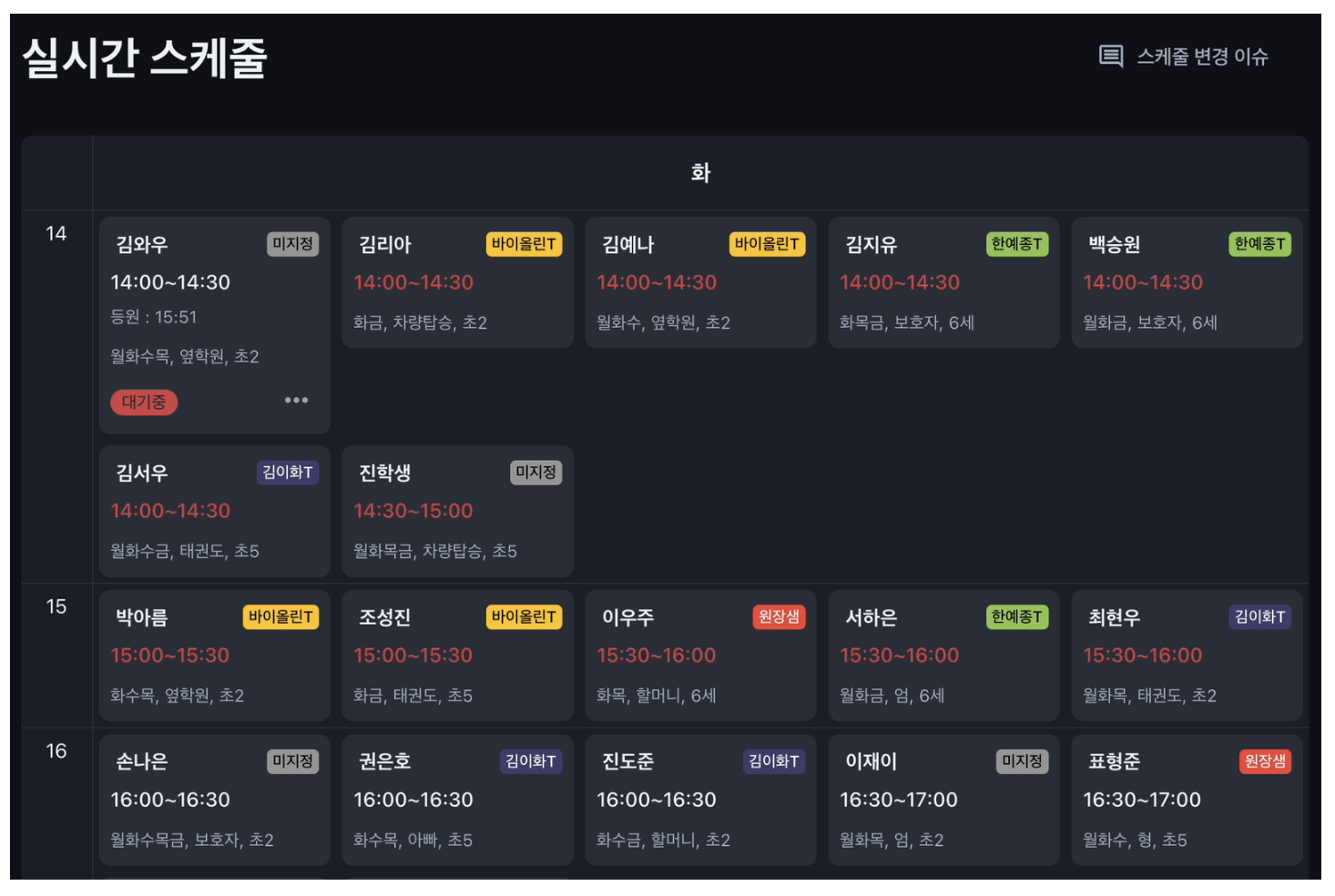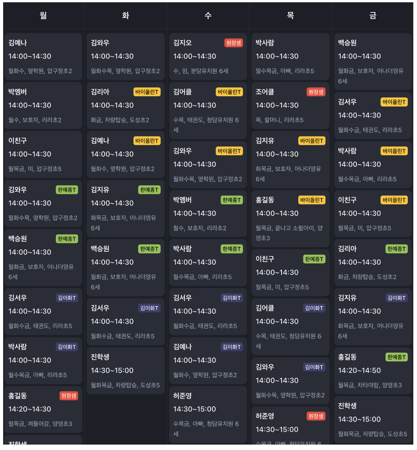 - 교사별 부담 체크: 각 교사는 고유의 컬러 태그로 표시되어, 누가 바쁜지 한눈에 확인 가능합니다. 예를 들어, 피아노 선생님이 과부하 상태라면 다른 교사에게 학생을 빠르게 재배정할 수 있습니다.