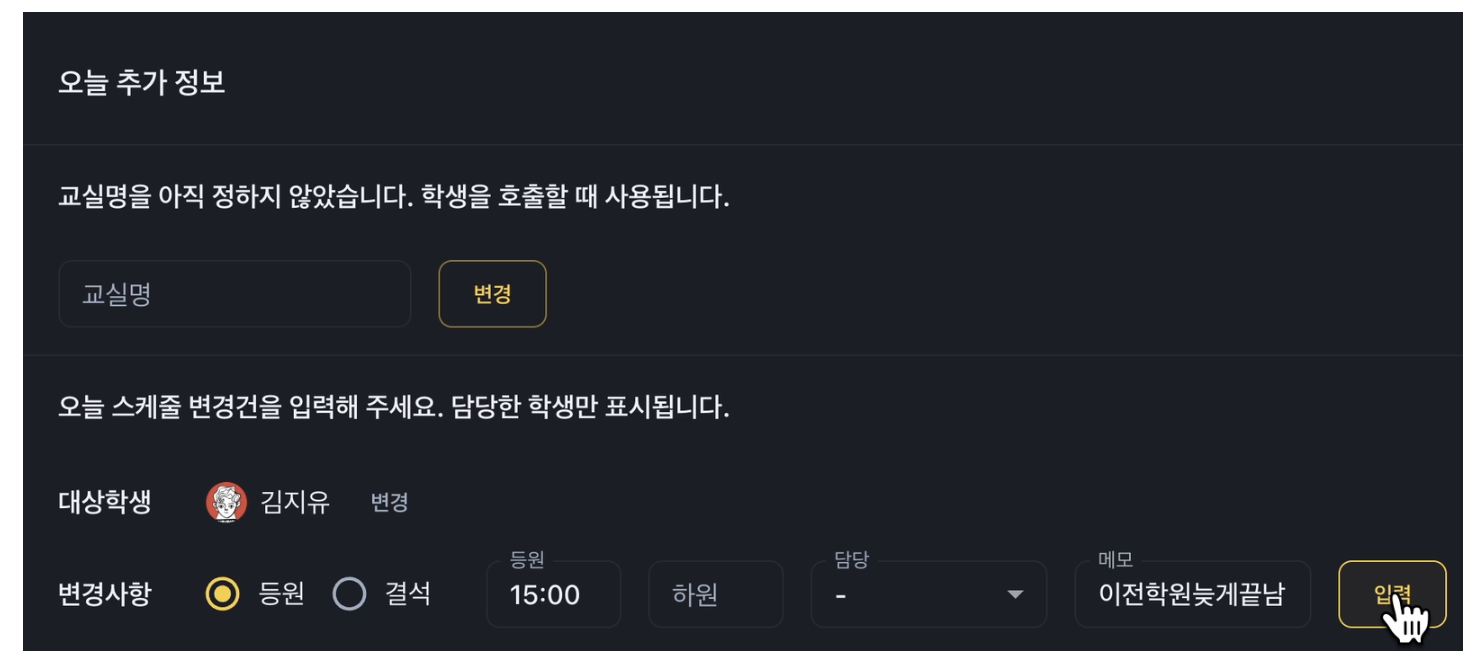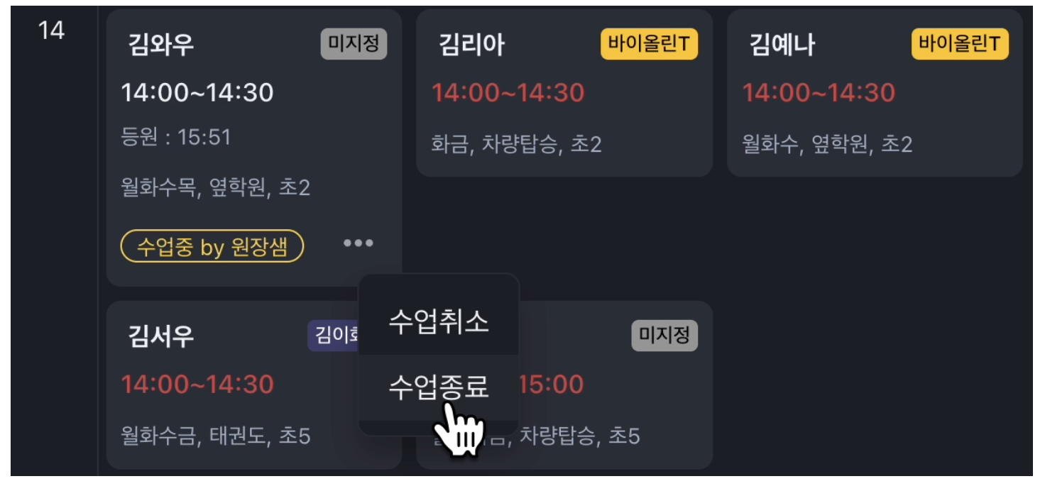 - 하원 처리: 하원한 학생의 카드는 자동으로 어둡게 표시되어, 남은 학생들에게 집중할 수 있습니다. 이는 학원 운영의 효율성을 높이고, 학부모님들에게도 신뢰를 줍니다.