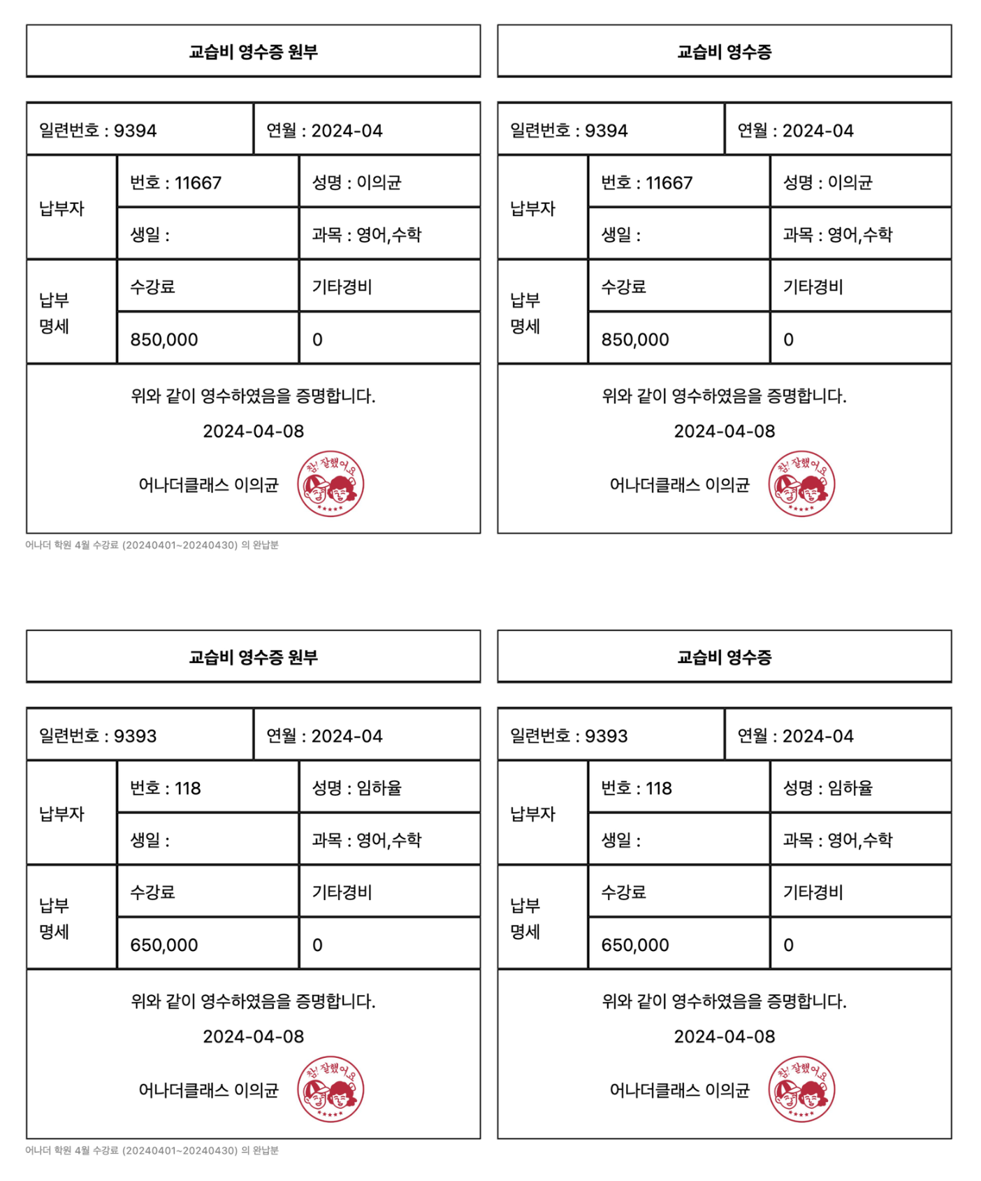 어나더클래스의 영수증 기능은 교육기간 시작일 또는 완납일을 기준으로 조회할 수 있습니다. 예를 들어, 4월 1일부터 4월 30일까지의 교육기간에 대해 3월 27일에 결제된 청구서는 다음과 같이 조회됩니다: