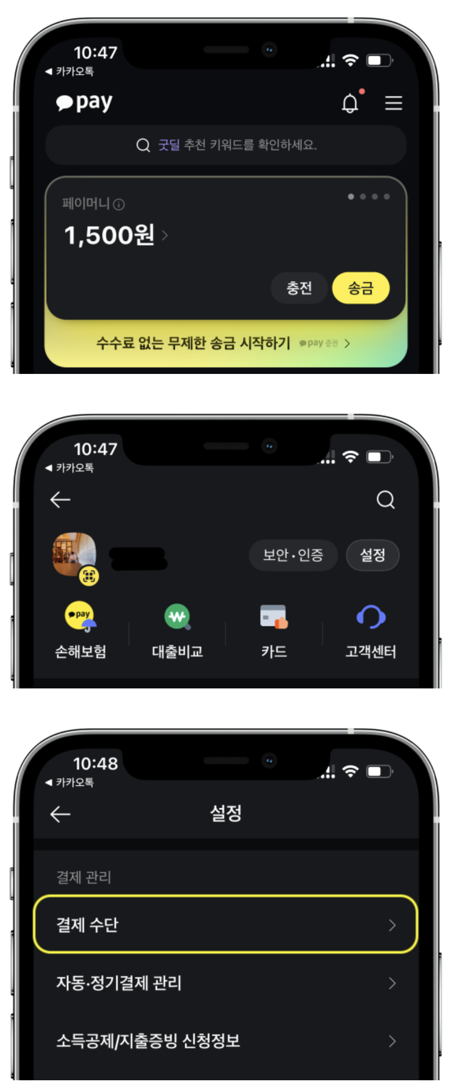 카카오페이 앱을 설치한 경우, 카카오톡 '더보기' - '페이' - 우상단 메뉴 버튼 - 우상단 설정 버튼 순서로 진행하면 됩니다.
