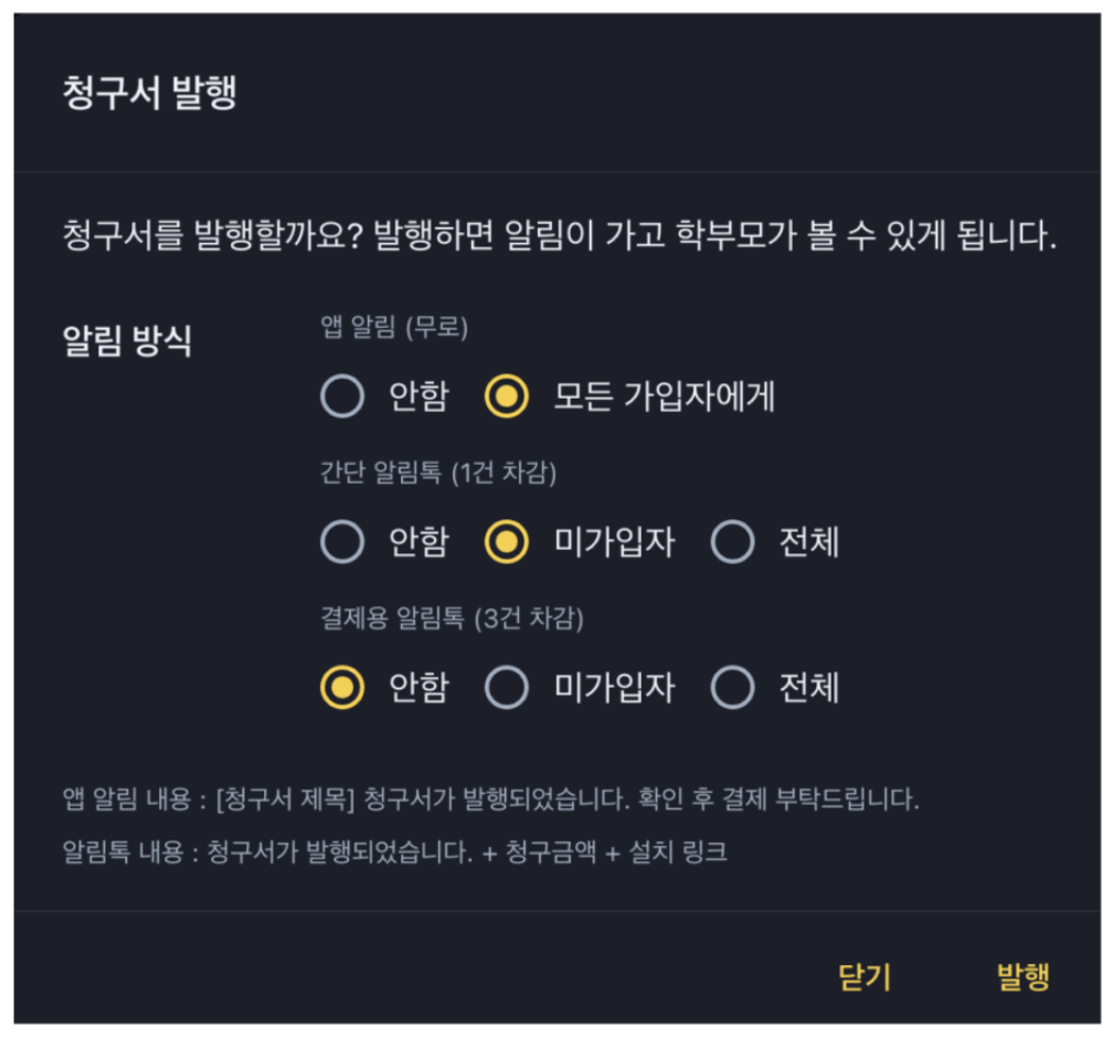 간단 알림톡: 청구서 제목, 금액, 앱 설치 링크가 포함된 알림톡(단문 1건, 16.5원)으로 빠르게 결제 정보를 확인하세요.