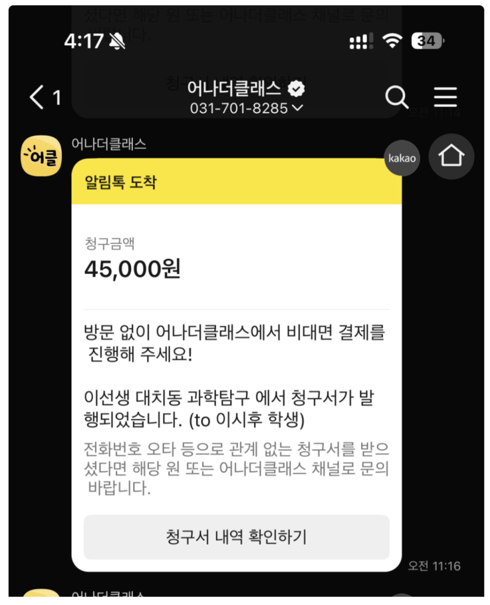 과거에는 학원비 결제를 위해 앱을 설치하거나 인증 과정을 거쳐야 했죠. 하지만 어나더클래스는 결제선생처럼 간편한 결제 경험을 제공합니다. 이제 학부모님들은 학원비 결제를 위해 앱을 설치하지 않아도 됩니다! 카카오 알림톡을 통해 청구서 정보를 받고, 단 한 번의 클릭으로 결제를 완료할 수 있어요.