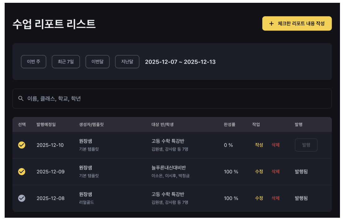 선생님은 학생 관리 > 리포트 탭에서 작성, 원장님은 미완료 항목만 확인.