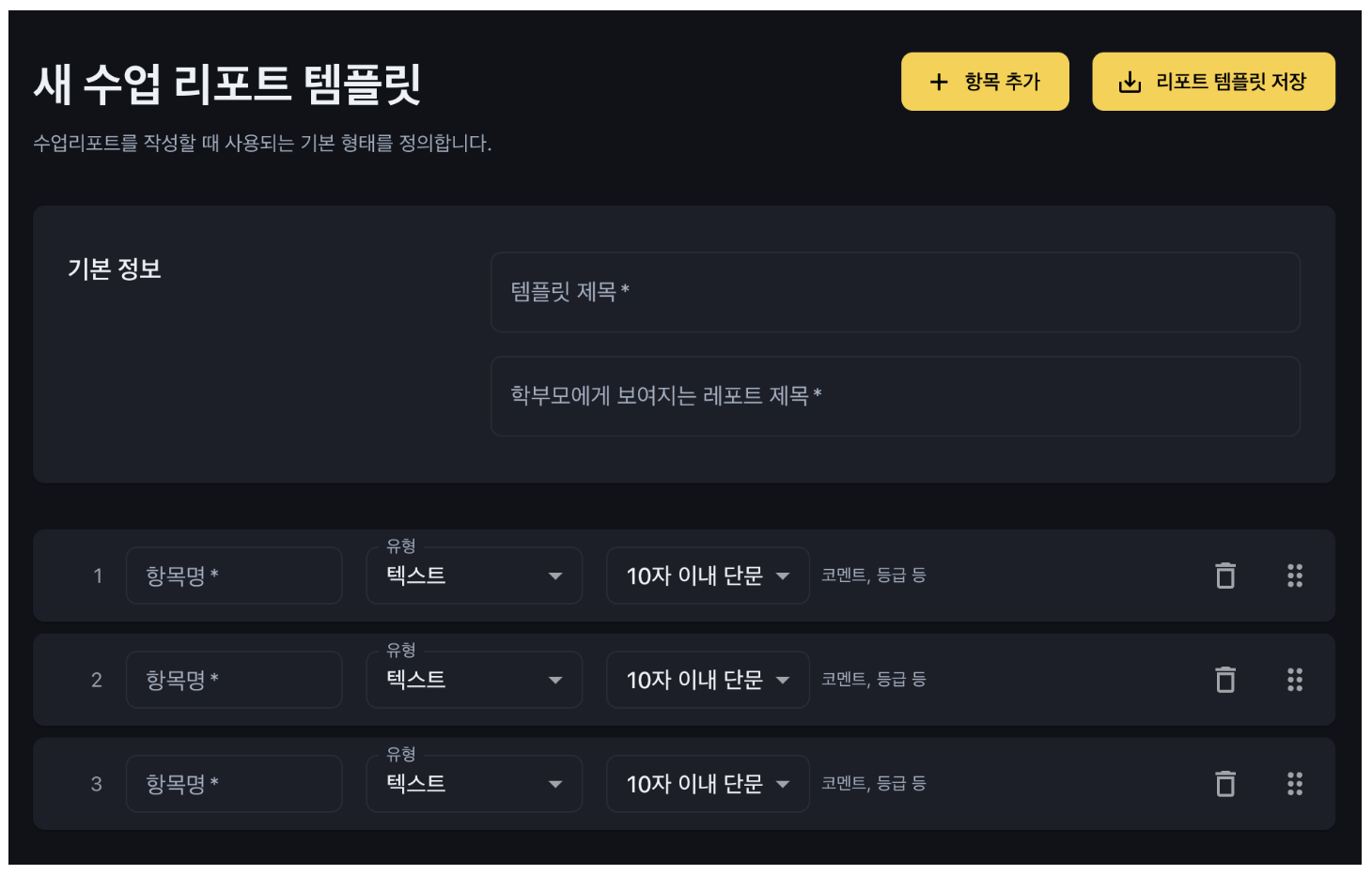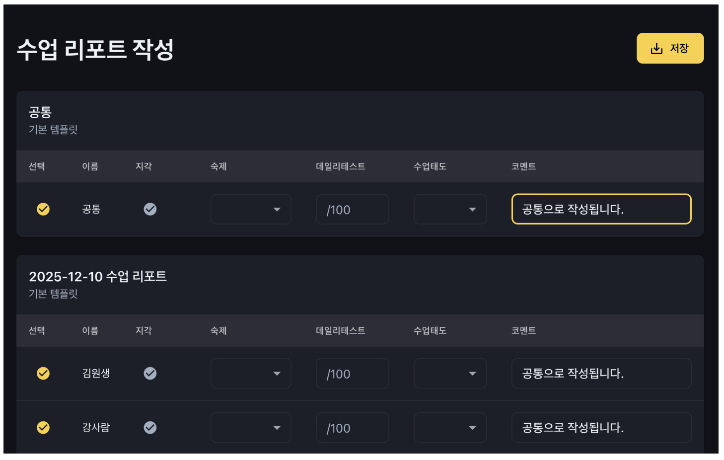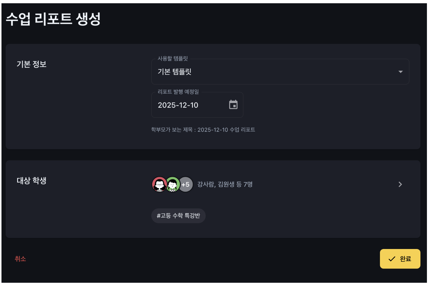 - 템플릿 제목 구분: 내부용(중등부용, 특강용 등)과 학부모님께 보여줄 제목 별도 설정.