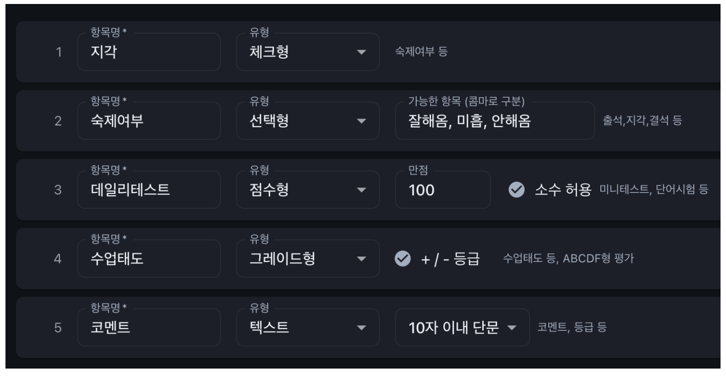 예: 단어 테스트 결과, 수업 태도 평가, 과제 완료 여부 등.