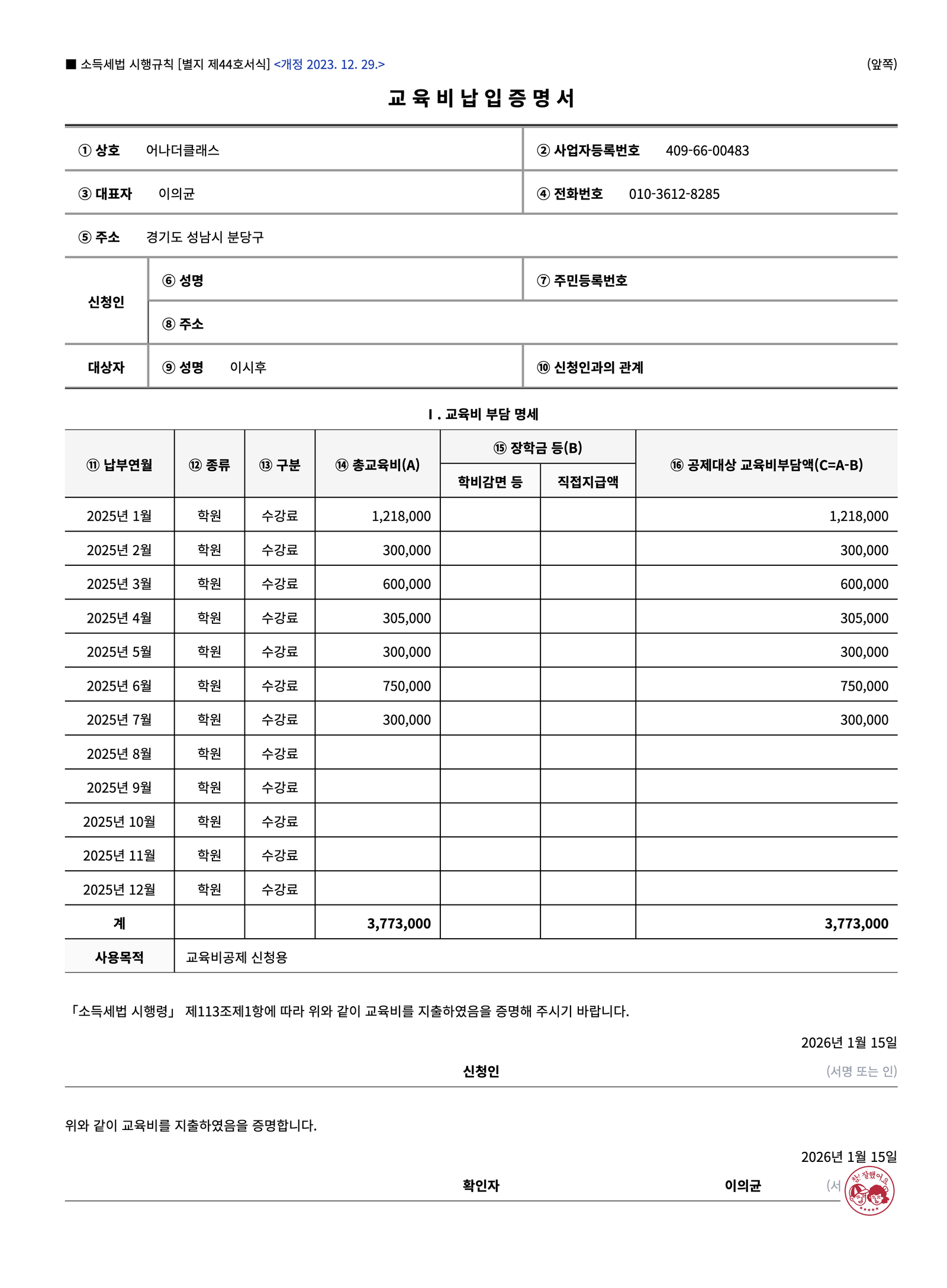 어나더클래스에서는 학원비를 기록하고 관리했던 그대로, 매우 편하게 연간교육비영수증을 발급할 수 있는 기능을 새롭게 오픈했어요.