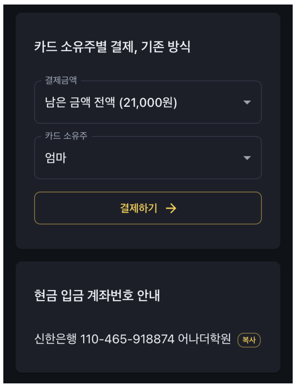 학원관리프로그램을 사용 중이시라면 어나더클래스를 꼭 확인해보세요. 지난해부터 학원비결제가 훨씬 빠르고 간편해졌습니다. 기존 카드 결제 방식도 그대로 지원하면서, 학원비결제 편의성을 대폭 높인 점이 가장 큰 변화예요.