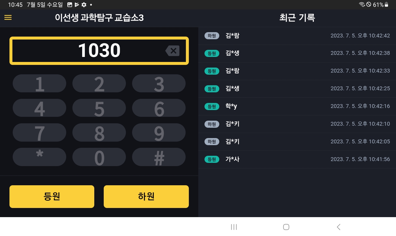 - 선생님이 본인의 출퇴근을 기록하는 방법 (#을 누르고 선생님 핸드폰번호 뒷 4자리)