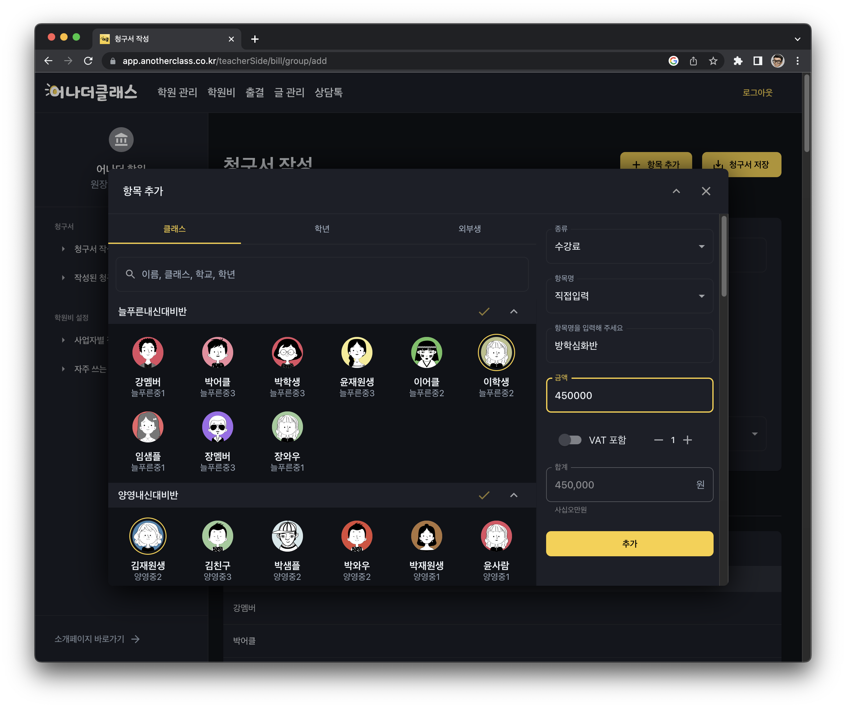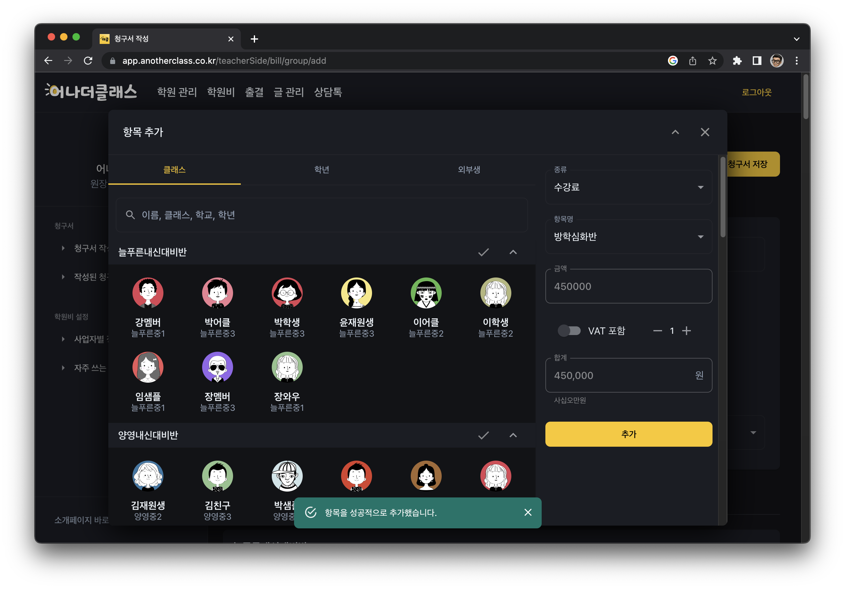 지금까지 많은 학원들은 비효율적인 방식으로 학원비를 관리하였습니다. '어나더클래스'는 그런 불편함을 기술적으로 해결합니다. 기존에 불편하게 느꼈던 청구서 작성, 할인 관리, 다양한 학원비 항목 설정 등 모든 것이 간편해집니다.