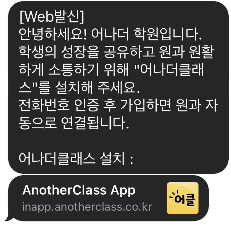 학원비결제에 진심인 어나더클래스를 시작하시려면 원장님 폰의 앱스토어 또는 플레이스토어에서 '어나더클래스'를 검색하신 후 어클 앱을 설치해 주세요. 원장님으로 원을 개설하시고 학생등록을 해주세요. 학생등록을 모두 하고난 이후 어클 앱의 더보기 - 초대메시지 발송을 이용해서 학부모님께 어클 앱 설치를 안내할 수 있습니다.
