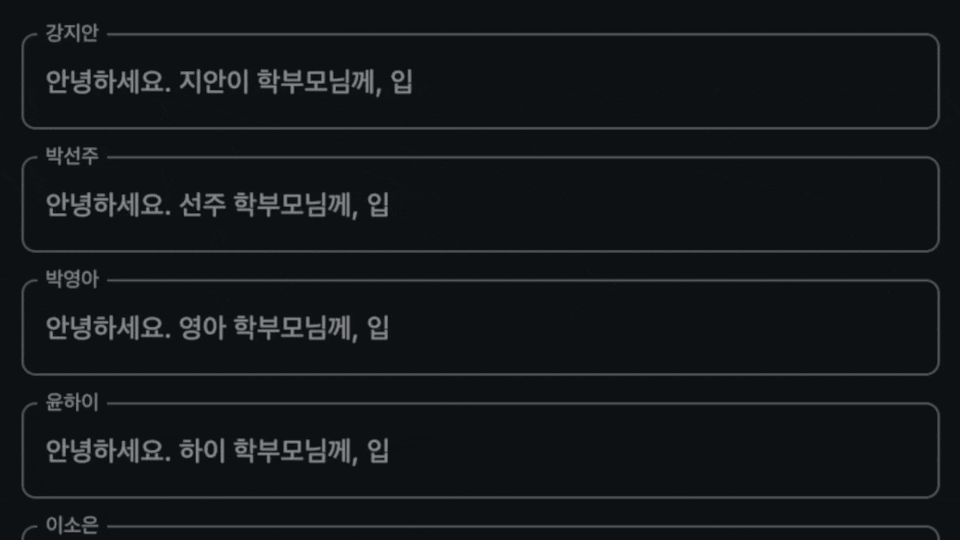 그래서 학부모님과의 지속적인 소통이 절실합니다. 통화에 대한 부담감을 가진 학부모나 바쁜 일정으로 인해 직접 상담 시간을 조율하기 힘들 분들도 계실텐데, 이런 상황에서 글로 이루어진 소통이 효과적입니다. 어나더클래스의 알림장은 아주 소통하기에 편리하게 구성되어 있고 한번 사용해 보시면 반하실 꺼에요. 지금까지 정말 이런 학원알림장쓰기는 없었거든요❤️