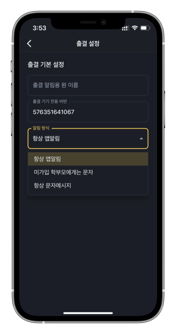 선생님이 직접 기록하는 출결에는 등원, 하원 뿐 아니라 수업, 결석 등이 있어 학원의 상황에 맞게 이용하시면 됩니다.