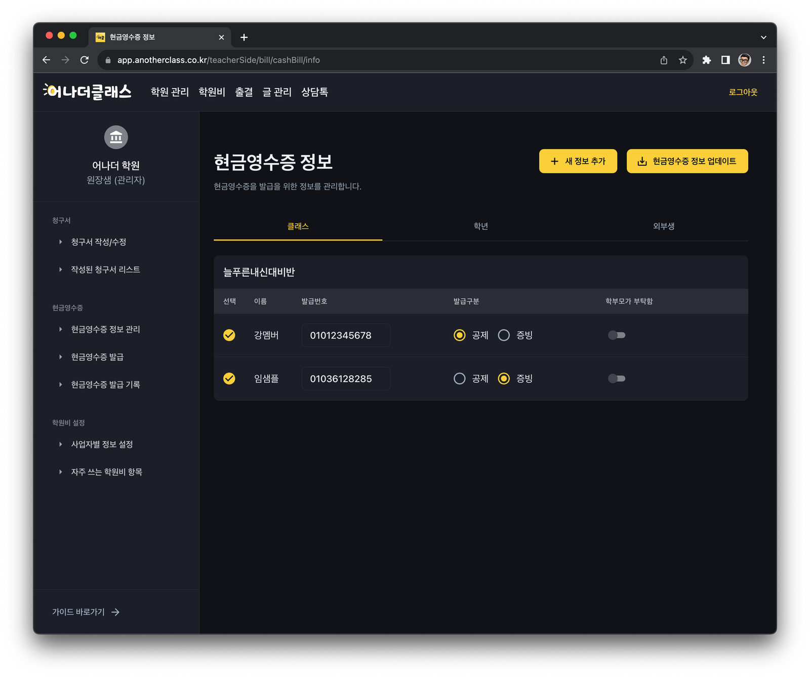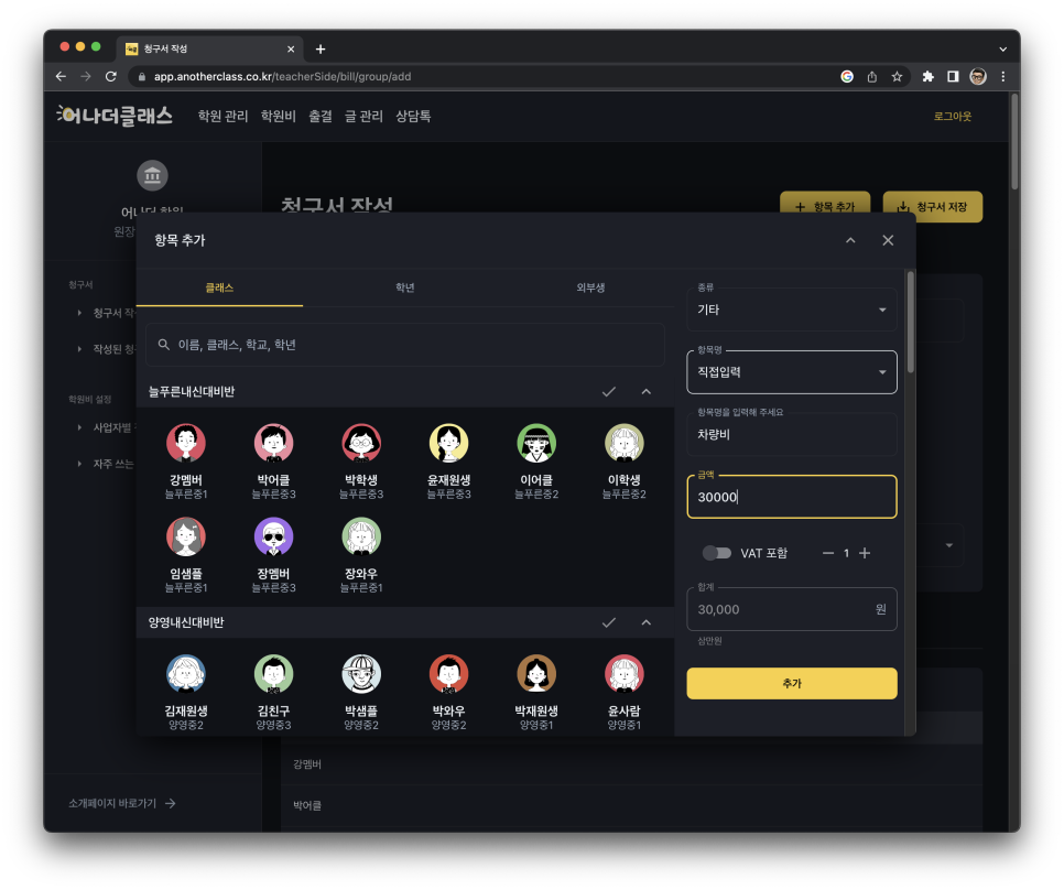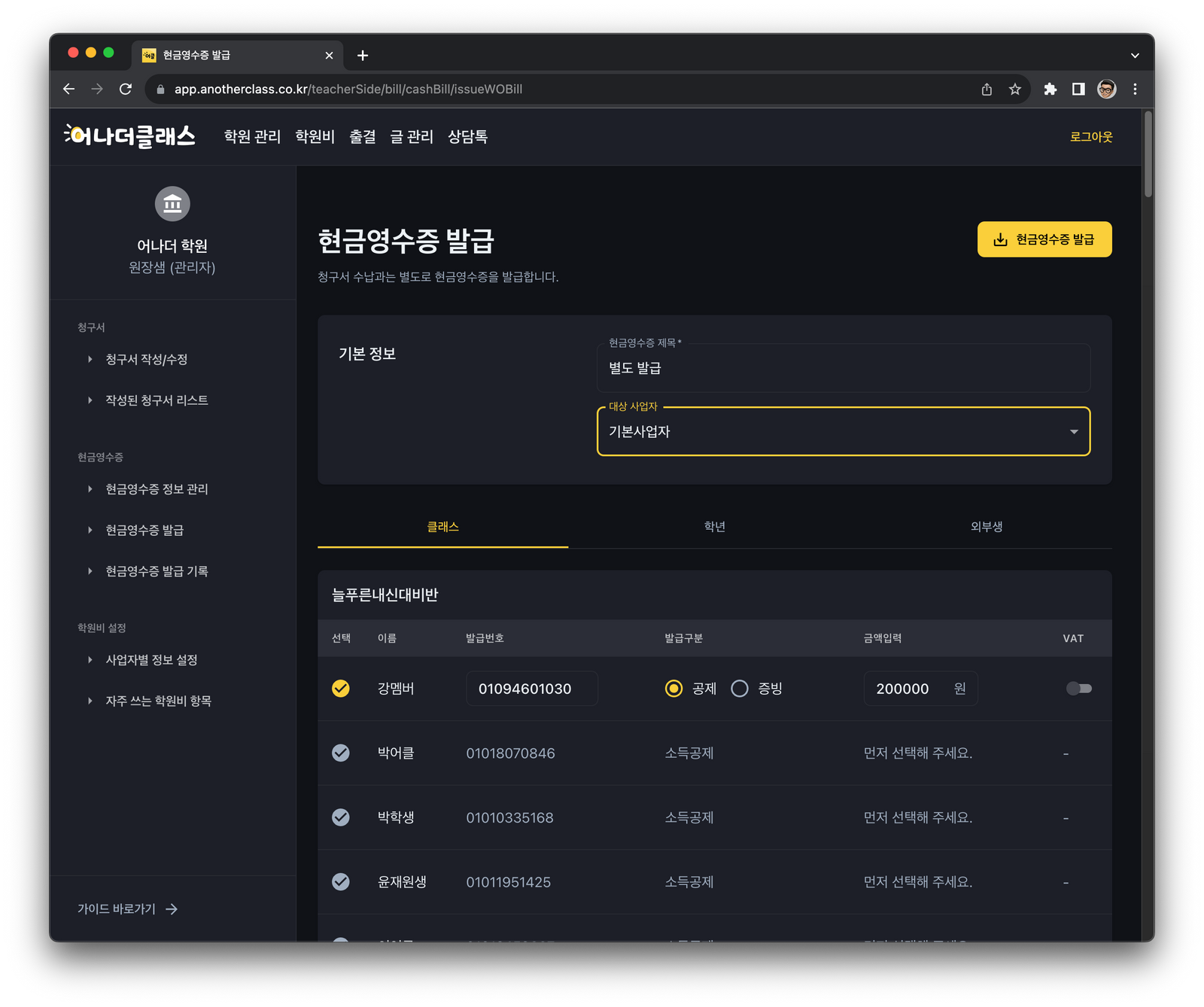 교육비 청구서발행이 매월 15만원 처럼 모든 원생이 똑같은 학원도 있지만 원생별로 각자 다 다르고 다양한 할인옵션등을 반영해야 하는 경우도 많습니다. 이런 다양한 경우라도 어나더클래스 학원비결제에서는 가능합니다.