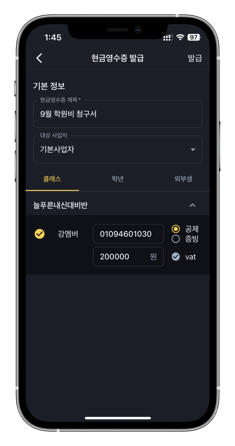 청구서에서 현금성 수납을 한 학생들을 모두 선택한 후 현금영수증 발급 기능을 사용하면, 현금성 수납 금액과 함께 현금영수증 발급 화면으로 진입합니다.