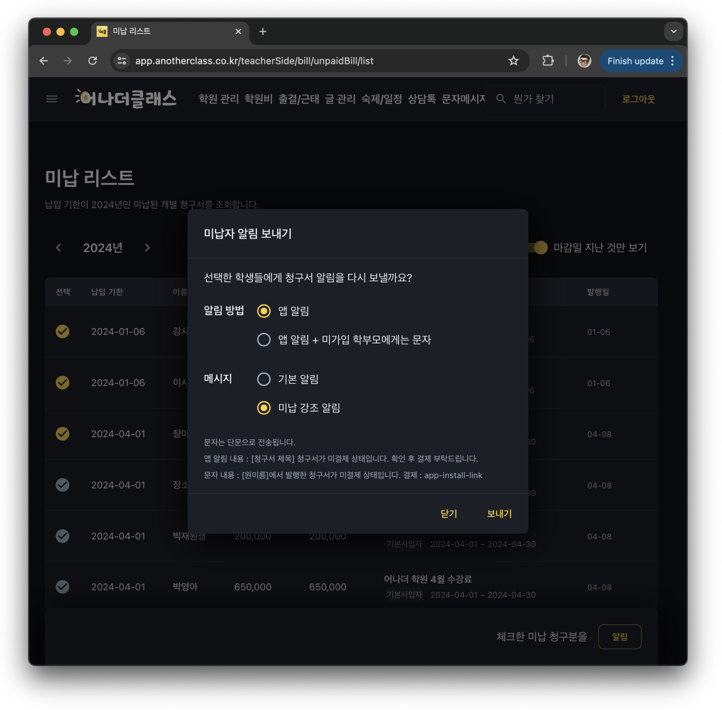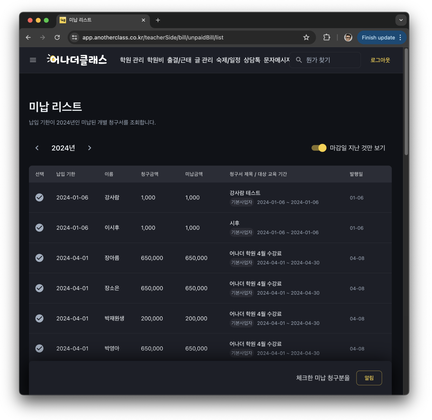 학원관리프로그램 어나더클래스 학원비결제에서 앞으로 수시로 확인하게 될 페이지인것 같습니다. 미납 청구서 리스트를 한번에 보고 학생을 선택해서 미납알림을 보내고 마감일 이전에 미리 챙길 수 있습니다.