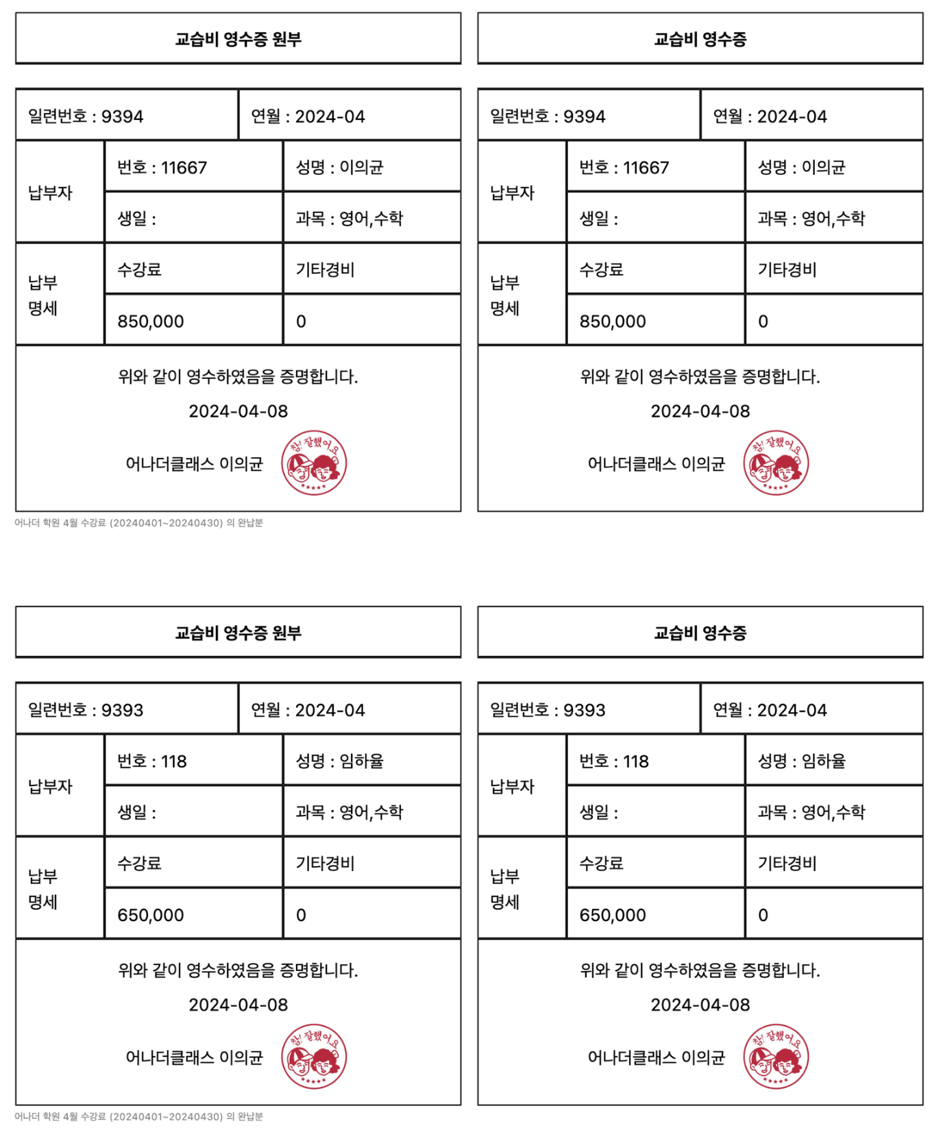 안녕하세요. 학원관리프로그램 어나더클래스에서 학원비결제 이후 교습비 영수증을 한번에 편리하게 출력하는 기능이 추가되었습니다. 현행 학원법과 시행규칙에 따르면 학원/교습소는 교습비 영수증 원부를 비치하도록 규정하고 있어서 학원비결제 수납관리와 운영에 큰 도움이 될 것 같습니다.