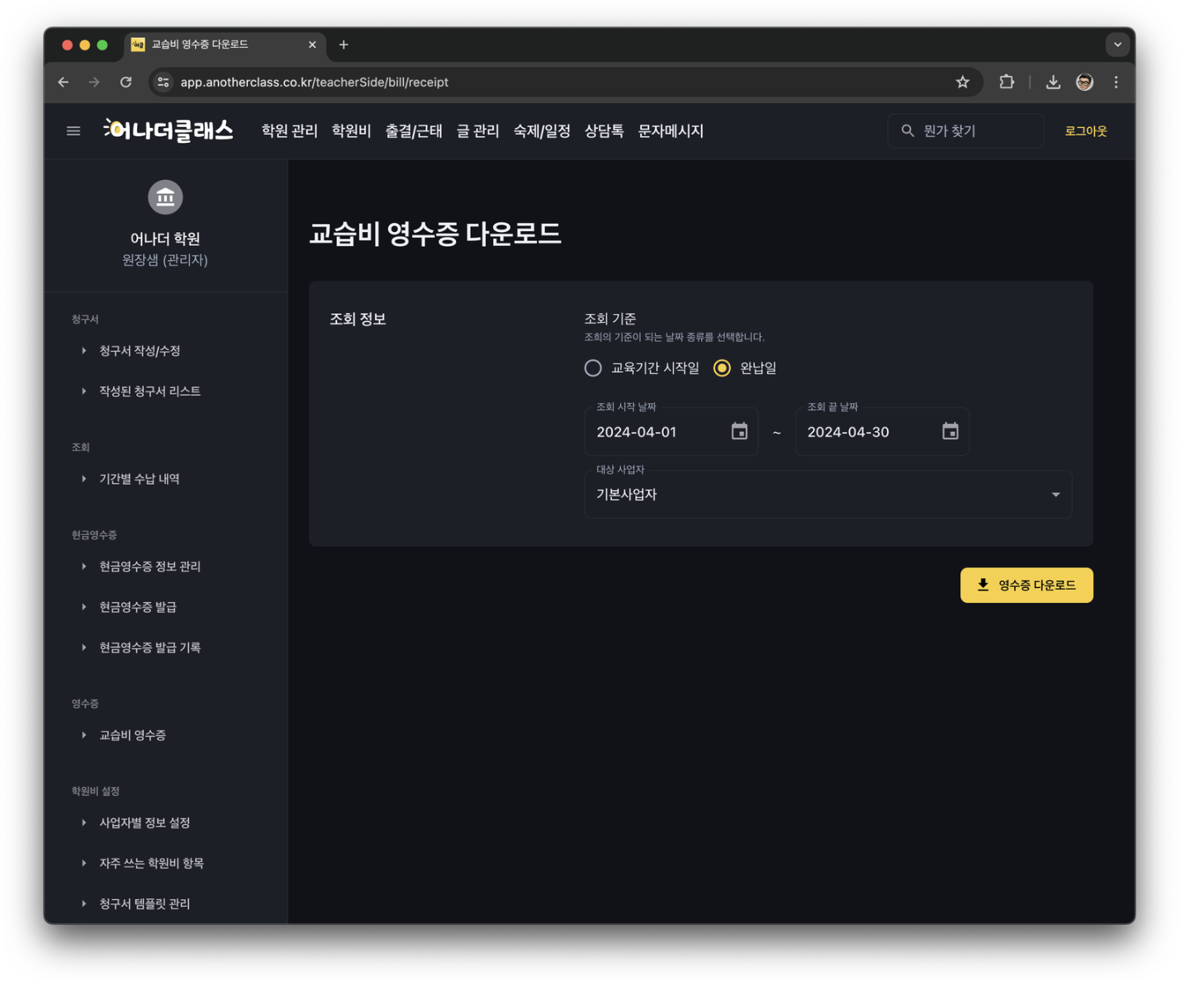 안녕하세요! 드디어 교습비 영수증 다운로드/출력 기능이 생겼습니다.