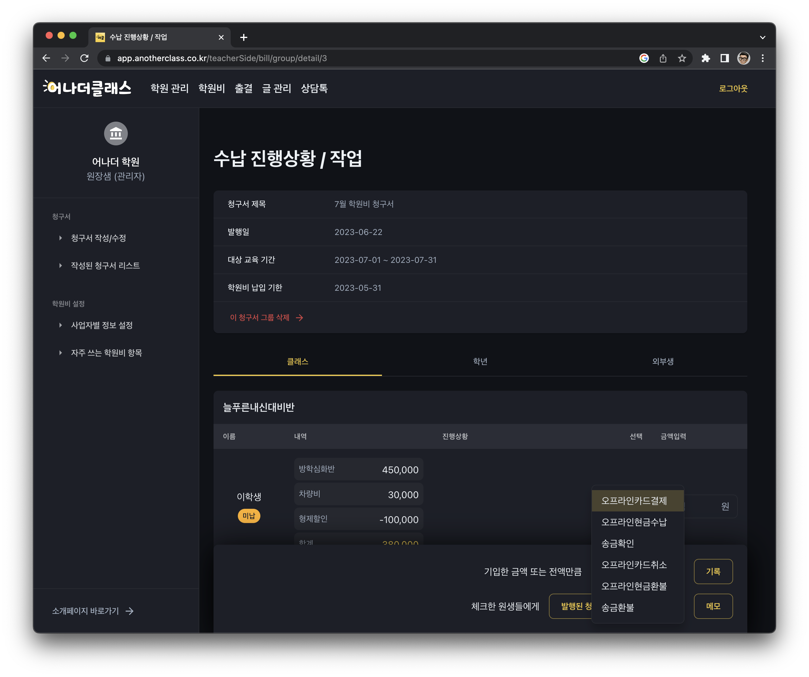 우선 어나더클래스에서 청구서를 발행하면 학부모님들께서 온라인 비대면으로 집에서 카드결제를 합니다. 이 경우는 수납이 자동으로 잡혀서 원에서 따로 기입하고 챙겨야 하는 부분이 전혀 없습니다. 매월말 교육비영수증만 일괄 발행하면 됩니다.