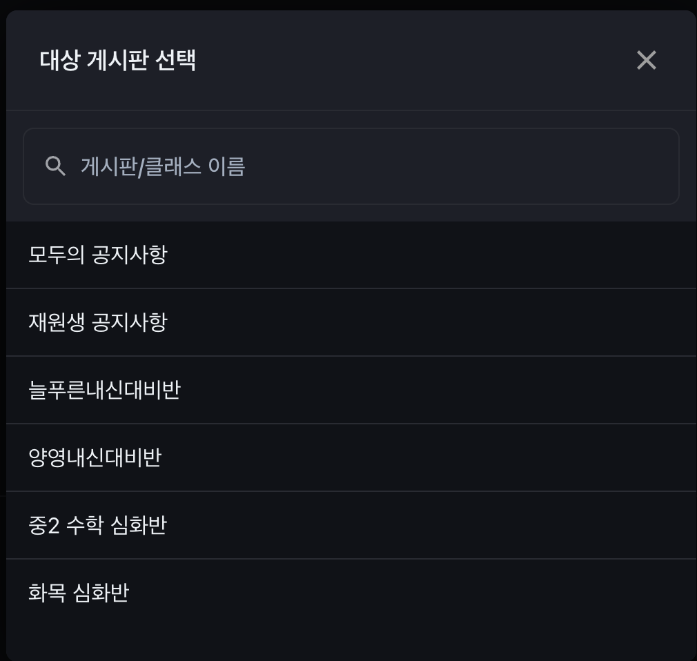 반별게시판 외에도 모두의 공지사항과 재원생 공지사항이 있어 원하는 형태에 따라 글을 올릴 수 있습니다.