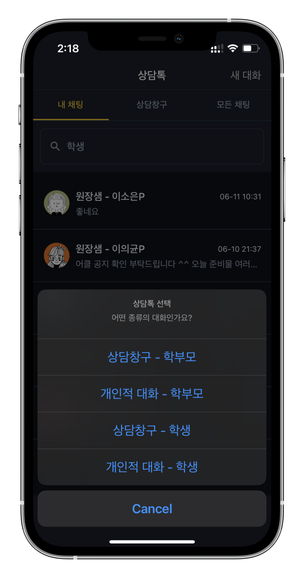 어나더클래스의 소통 기능 중 상담톡은 실시간 상담이 가능하고 학원의 전화 업무를 대신해 줄 수 있습니다. 개인적 대화와 상담창구를 구분해서 상담이 가능하며 상담창구의 경우 여러 담당 직원이 응대할 수 있습니다.