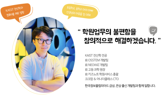 안녕하세요. KAIST 전산학과 출신, 중학생 아이의 아빠이자 IT 서비스 개발자입니다. 분당 정자동 입소문난 최상급 학원 위주로 아이를 보내고 있습니다. 10년의 학원 교육 및 IT 서비스 경험을 보유하고 있습니다. 대치동에서 과학을 열심히 가르치던 중, 아이 학원 선생님을 도와주려다 멋진 학원솔루션이 나와 버렸습니다. 지금은 완전히 소프트웨어 개발에 몰입하여 열심히 하고 있습니다. ^^"