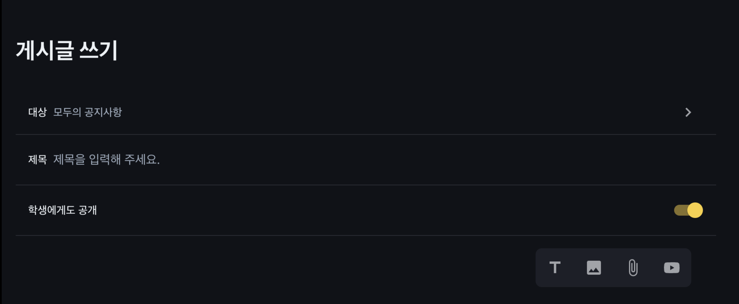 그리고 게시글을 쓸때 학생에게도 공개 옵션이 있어 학부모에게만 공개할지 또는 학생에게도 공개할지를 선택할 수 있습니다.