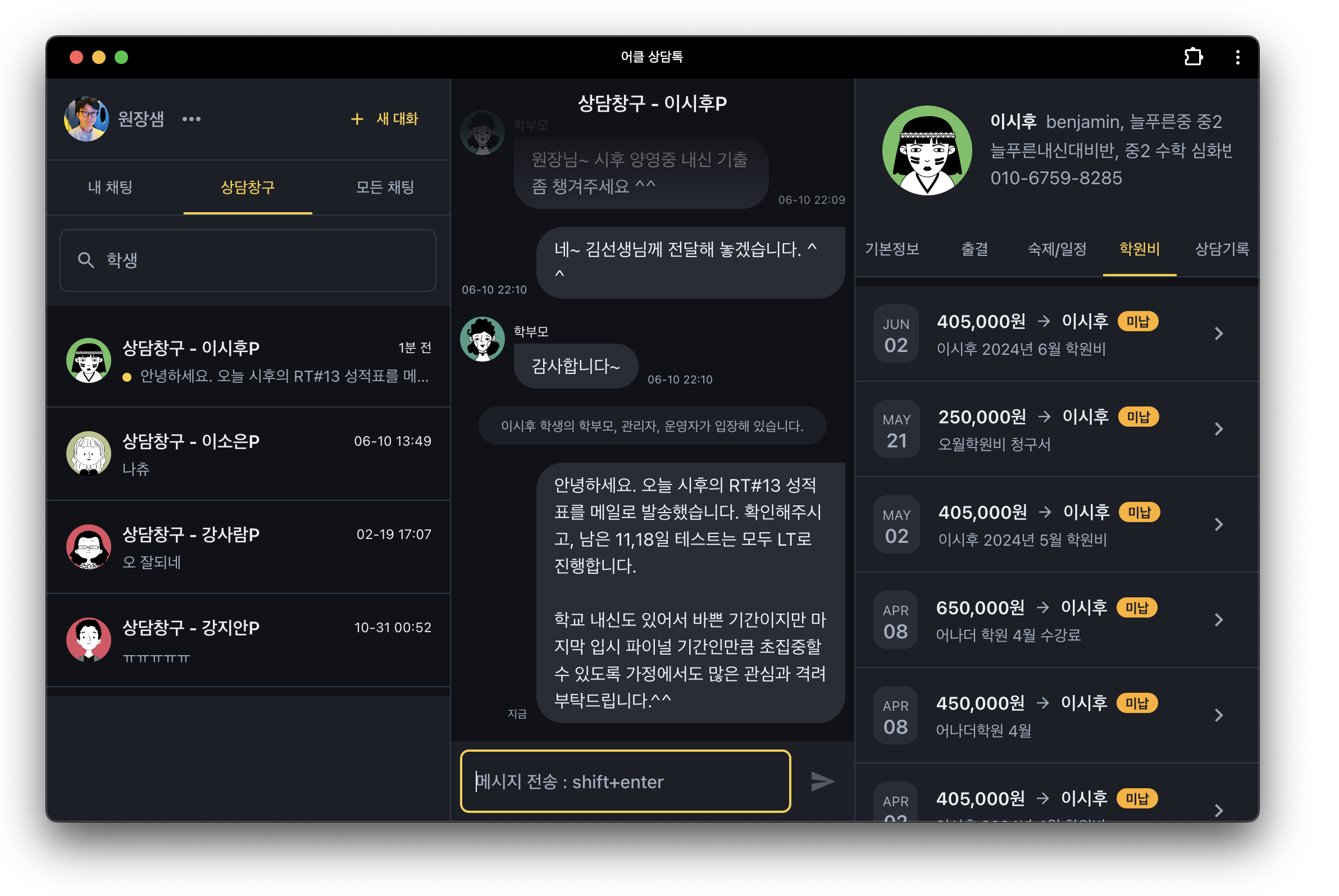 어나더클래스 pc상담톡은 독립된 앱으로 서비스하고 있어 항상 켜두고 수시로 확인할 수 있습니다. 그리고 상담톡 옆 학생과 관련된 정보를 확인하고 수정할 수 있어 응대가 빨라지고 작업의 효율이 높아집니다.
