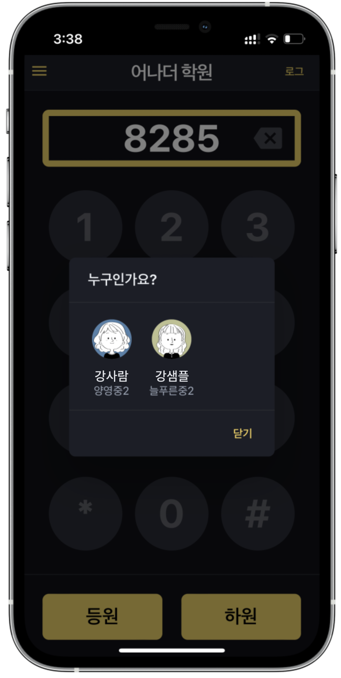 누구인가요? 물어볼때 강사람 친구는 강사람을 터치, 강샘플 친구는 강샘플을 터치하면 엄마에게 알림이 갑니다.