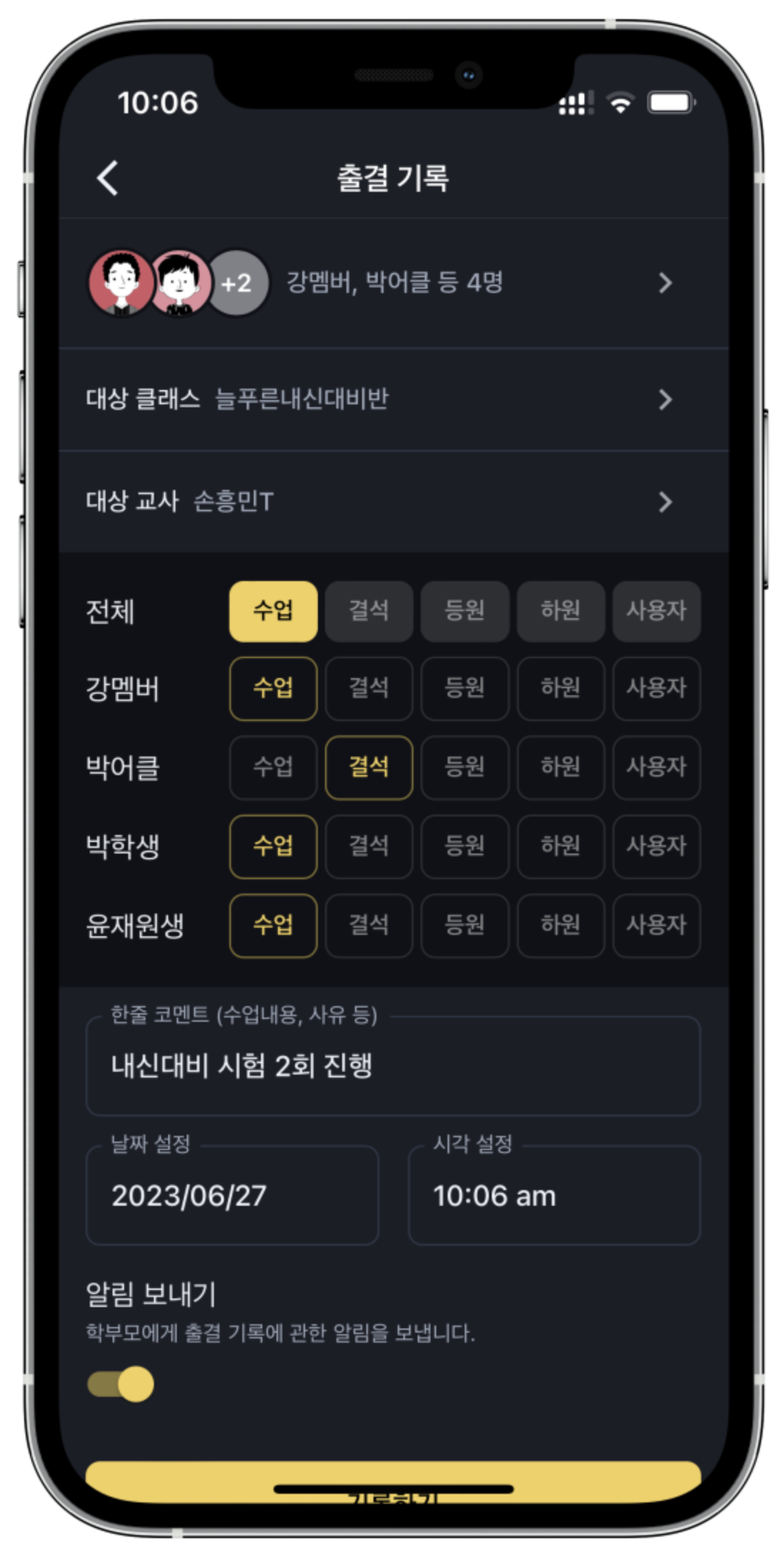 두 친구가 차례대로 학원출결 기록을 했다면 엄마는 따로따로 알림을 받을 수 있을것 같습니다.