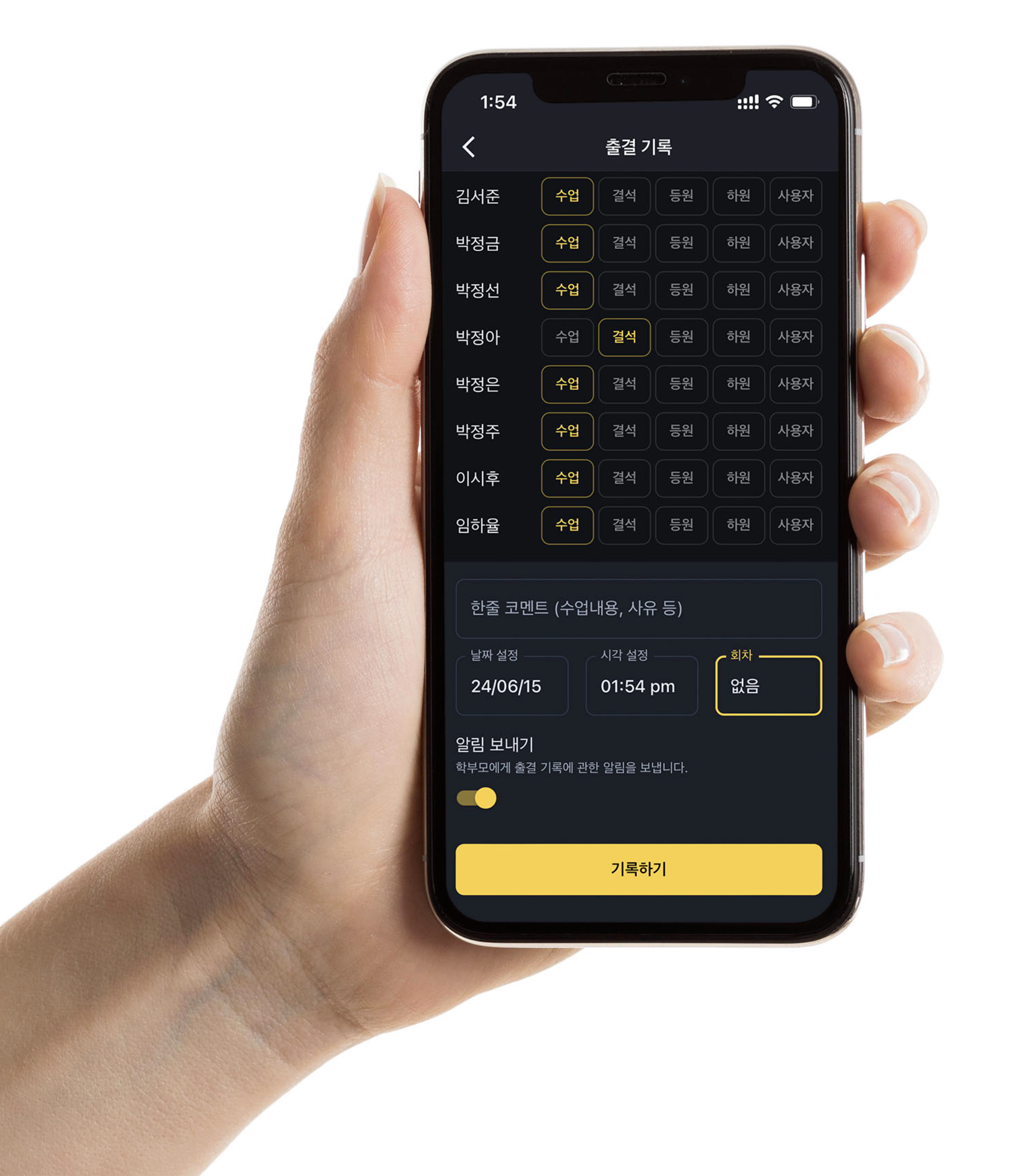 학생이나 교사가 직접 출석을 기록할 수 있어, 교육 과정의 진행 상황을 실시간으로 파악할 수 있습니다. 결석생 관리는 물론, 수업 메모를 통해 학부모와의 커뮤니케이션도 강화할 수 있습니다.