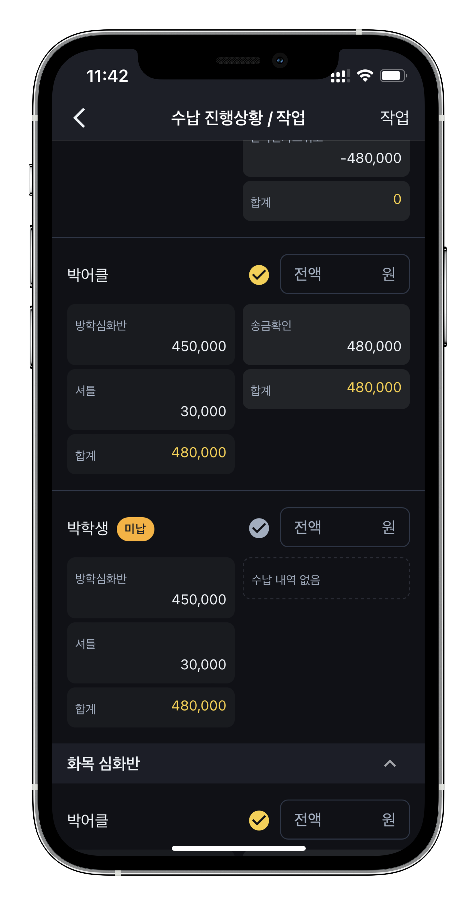 어나더클래스 비대면 학원비 카드결제의 경우라면 바로 입금반영이 되어 확인이 가능합니다. 하지만 수납을 하다 보면 송금, 학부모님께서 학원에 오셔서 결제 등 다양한 경우가 있습니다. 이런 경우라도 어나더클래스에서는 다 기록하고 관리할 수 있습니다. 기존의 수납을 위해 엑셀을 따로 관리하셨다면 어나더클래스에서는 앱 안에서 관리와 확인이 다 가능하니 운영하시기 편하시겠죠?